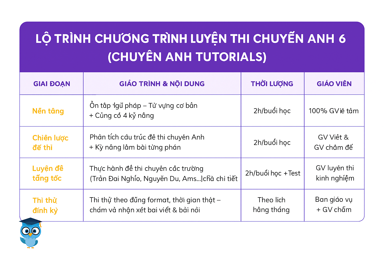 Chương trình được đội ngũ giáo viên tại Chuyên Anh Tutorials nghiên cứu chuyên sâu, cập nhật sát với cấu trúc đề thi tuyển sinh vào lớp 6 chuyên Anh các trường top đầu